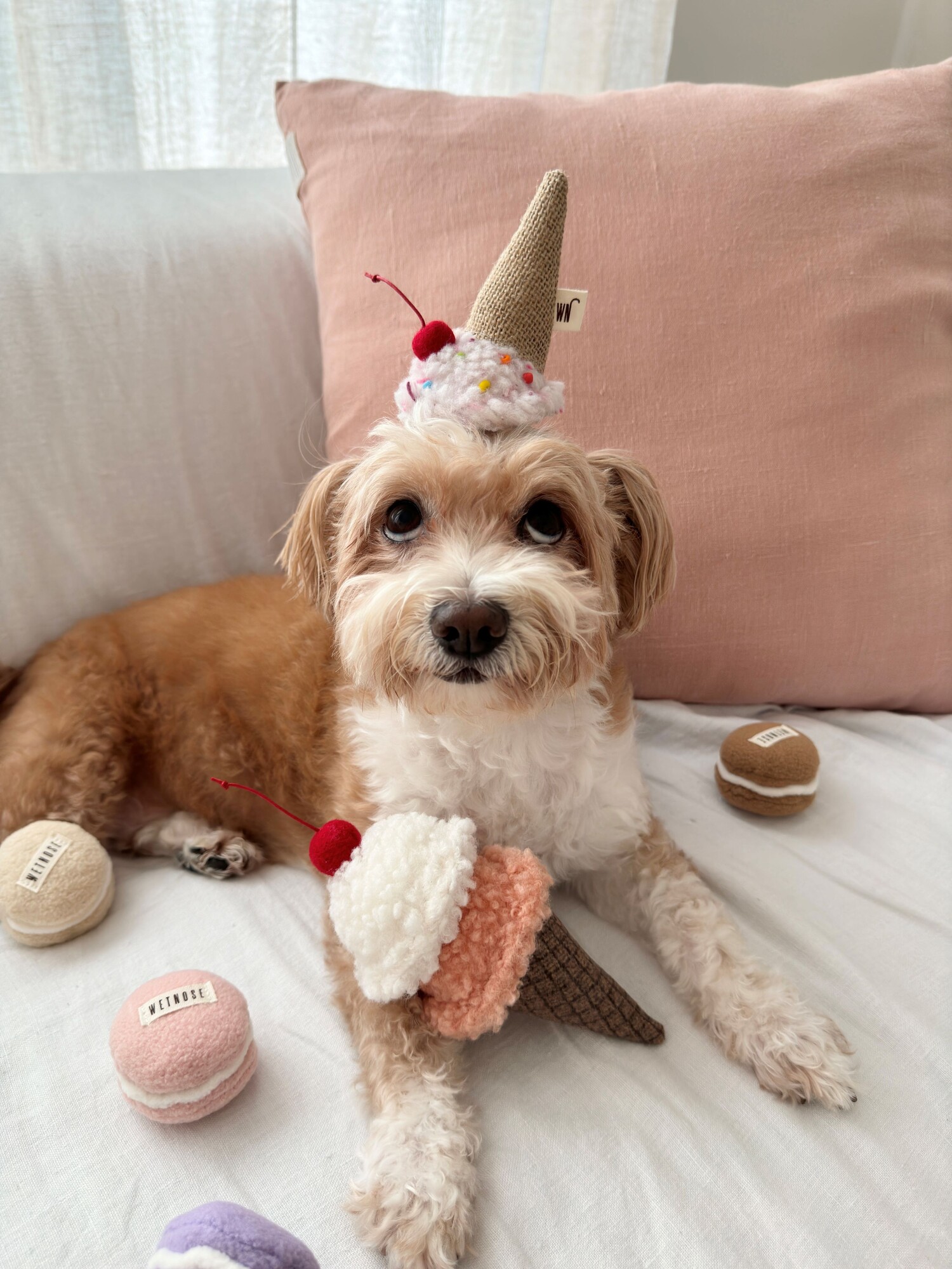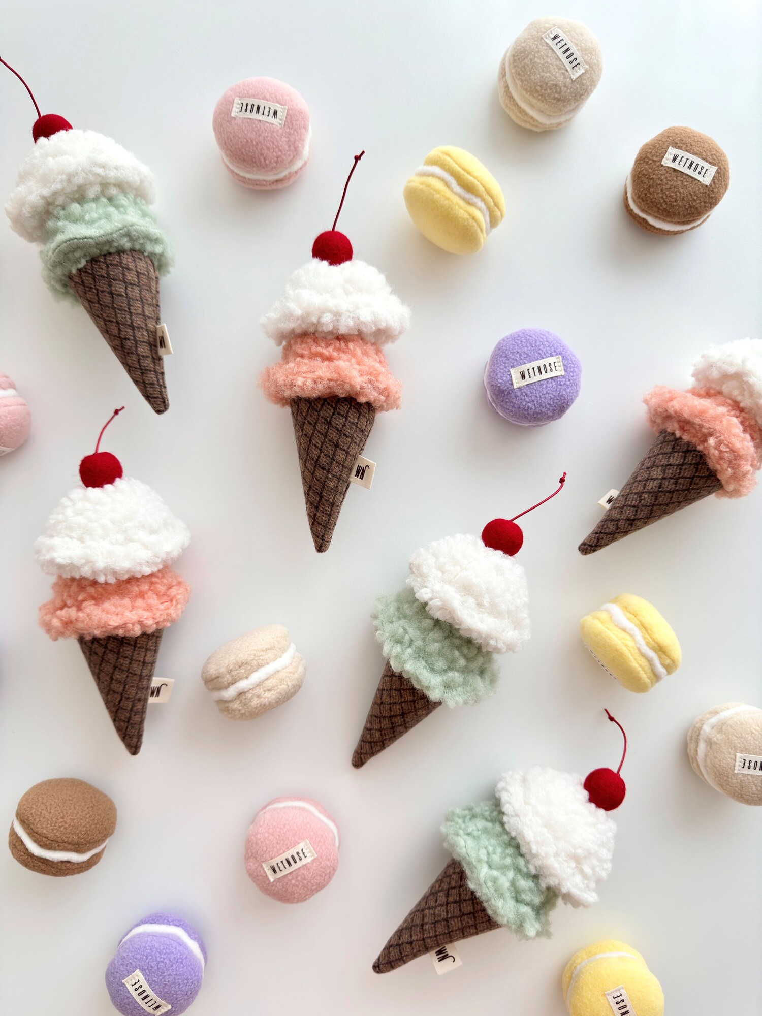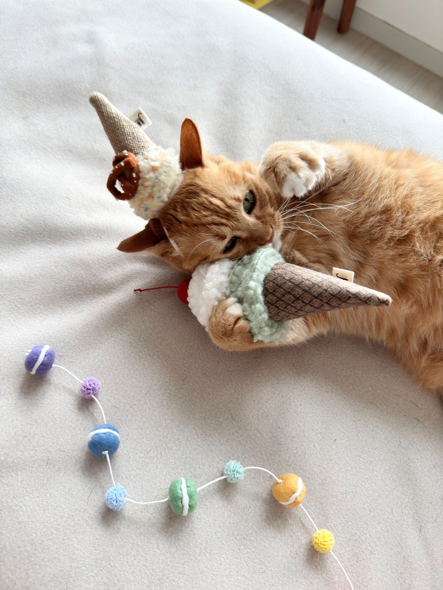 콘 부분은 바스락 소리가 나고 아이스크림 안에는 딸랑이와 국내산 유기농 캣닢 또는 마따따비 잎이 솜과 함께 들어가며