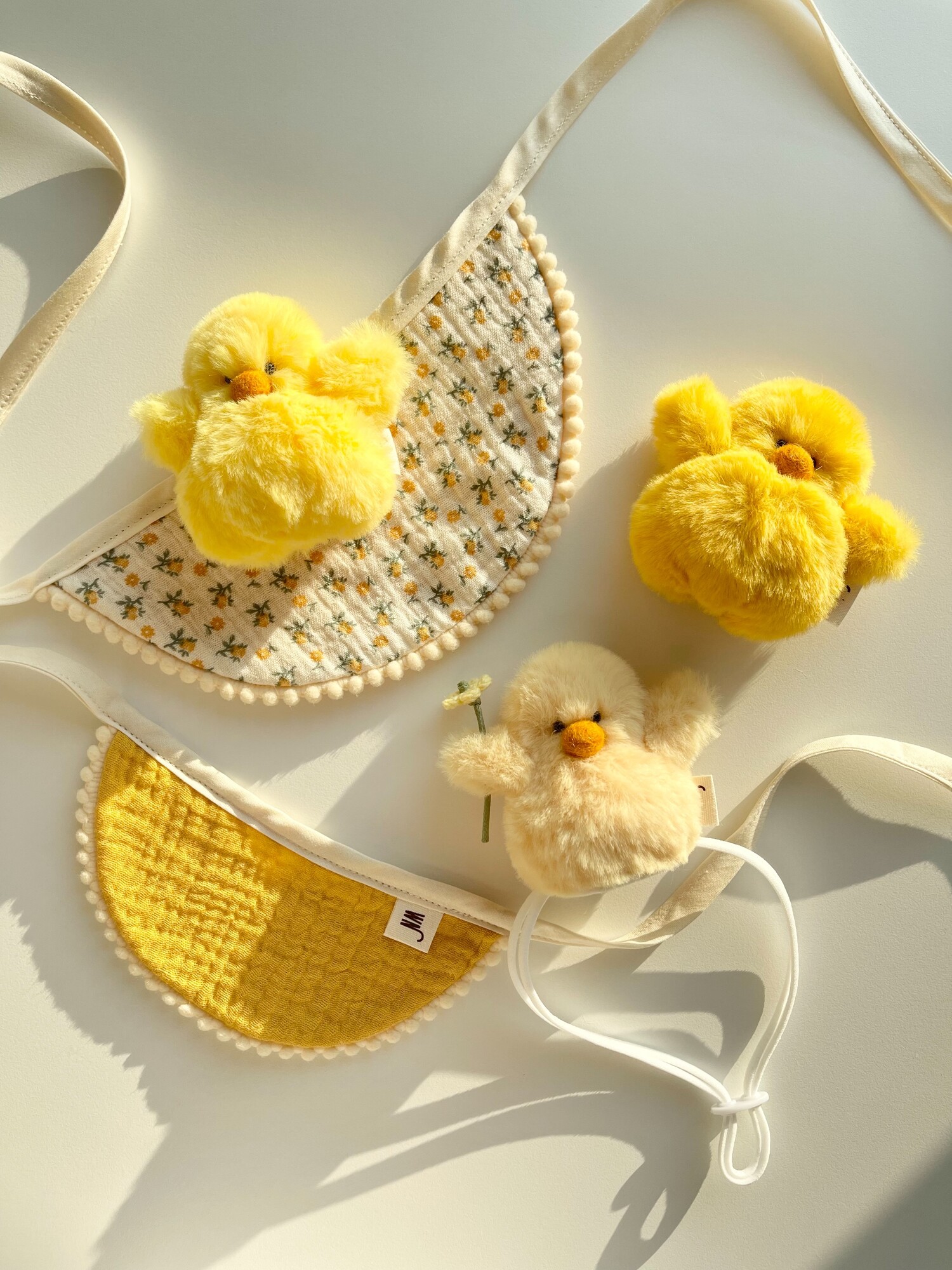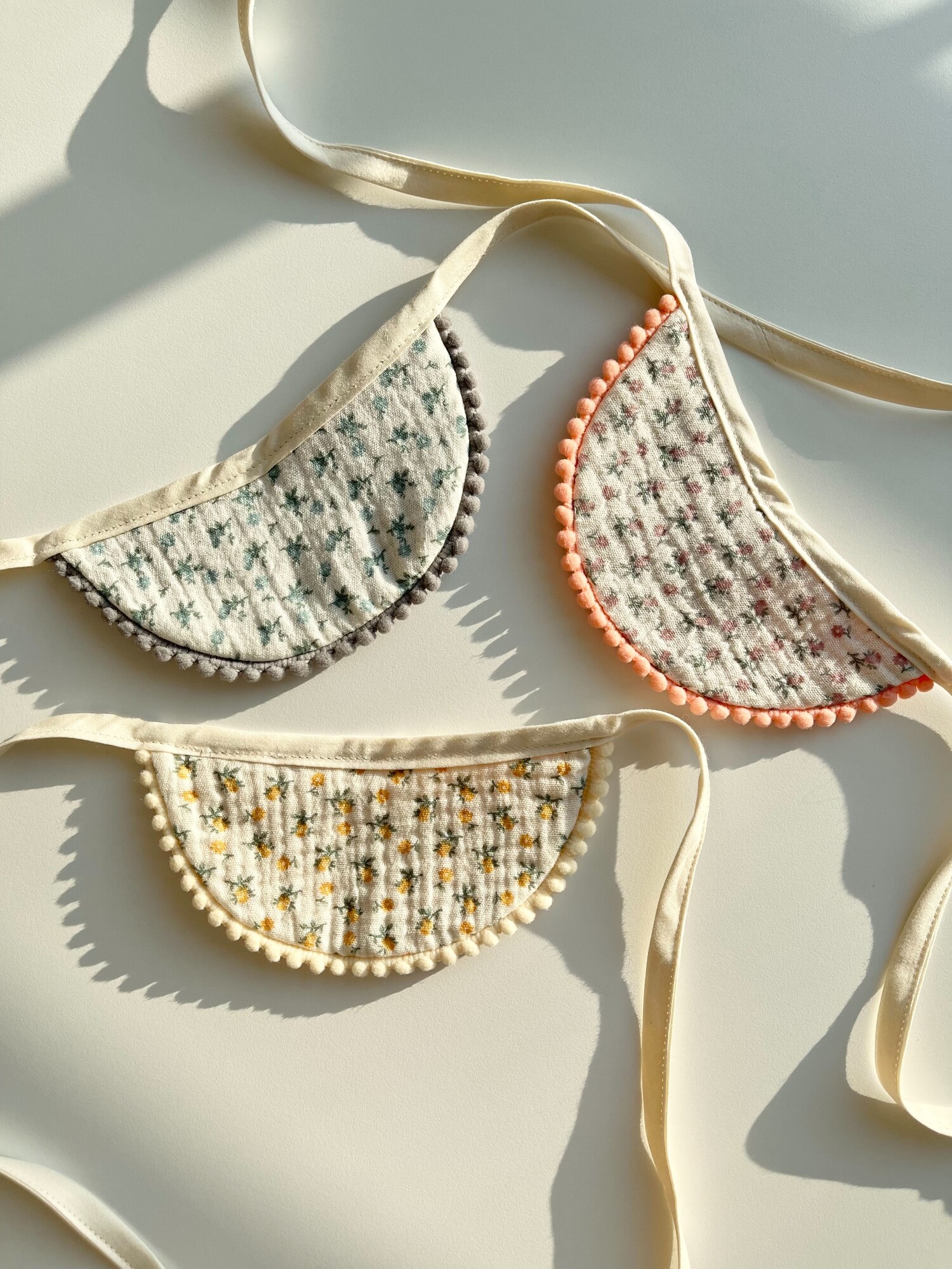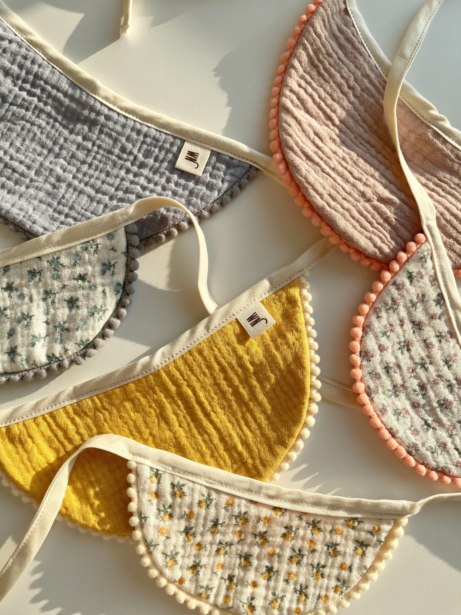 머스터드,핑크,블루 3가지 컬러의 턱받이는 앞면은 무지, 뒷면은 플라워 원단을 사용해서 두가지 스타일로 양면 사용이 가능합니다.