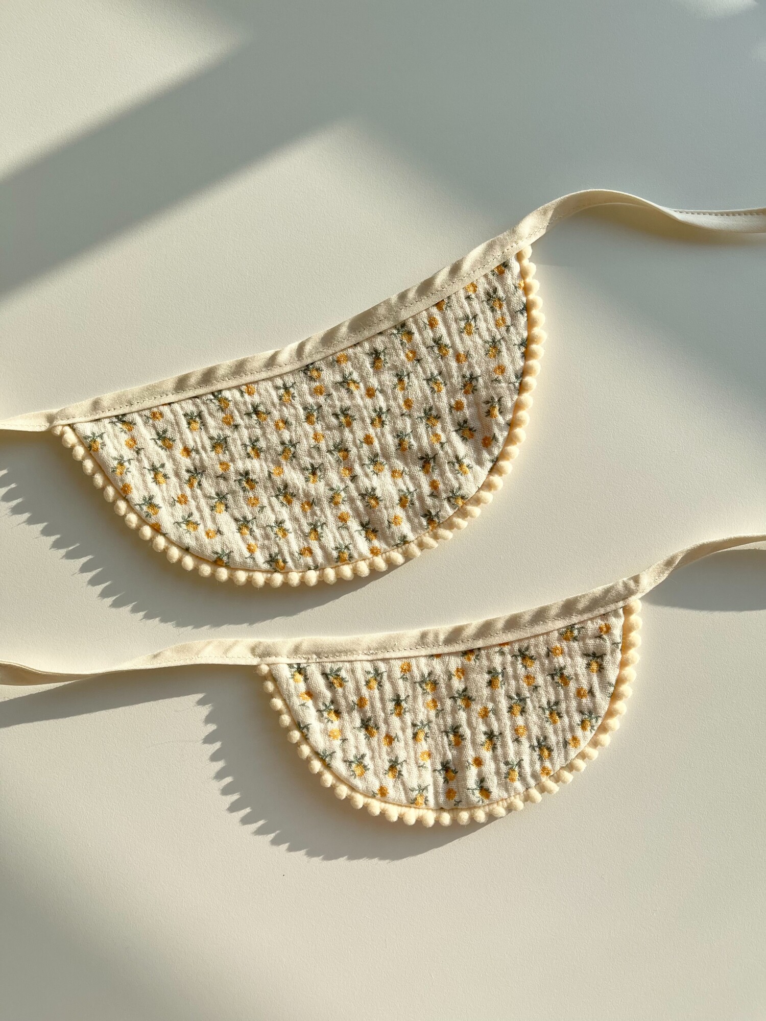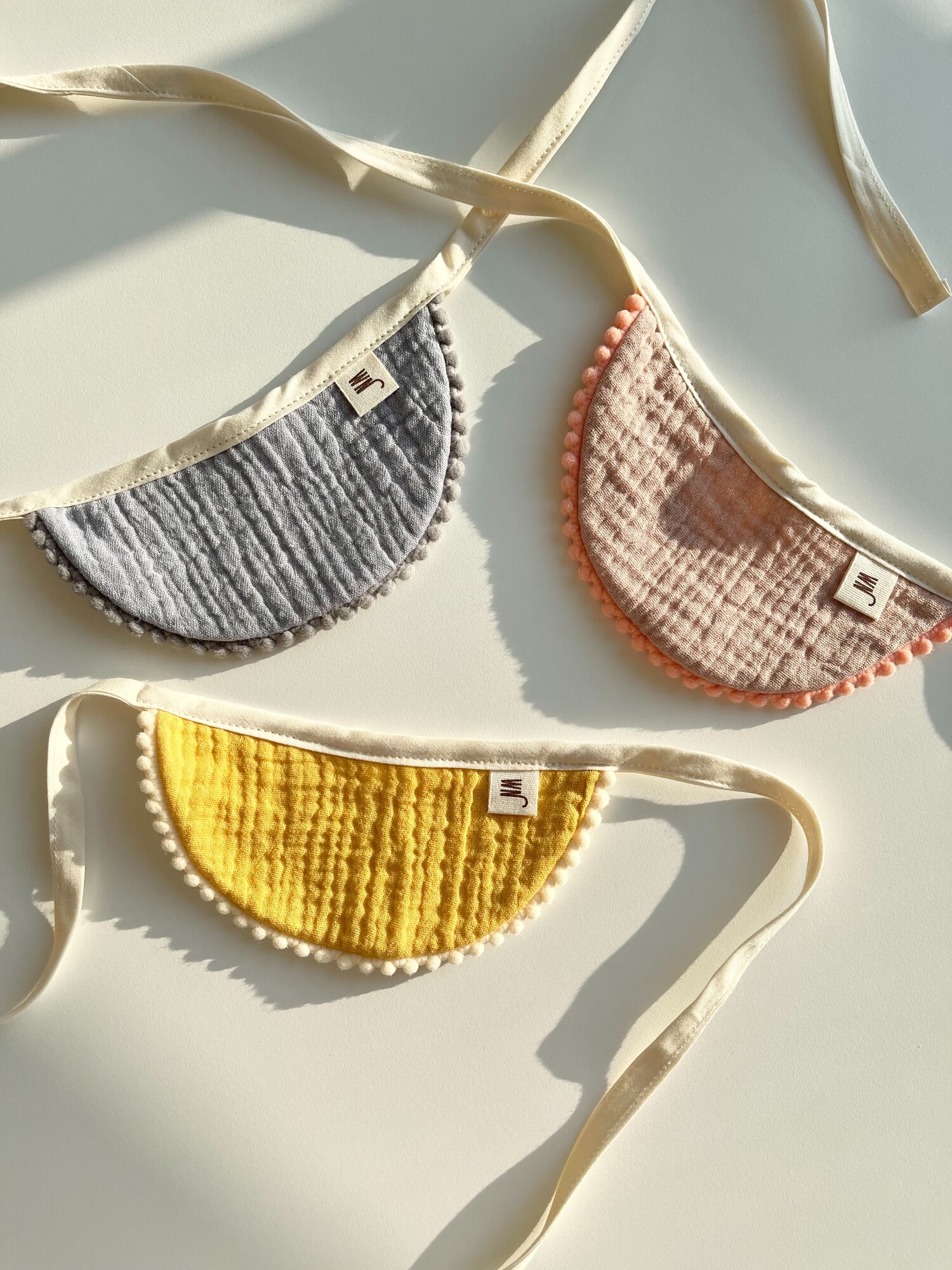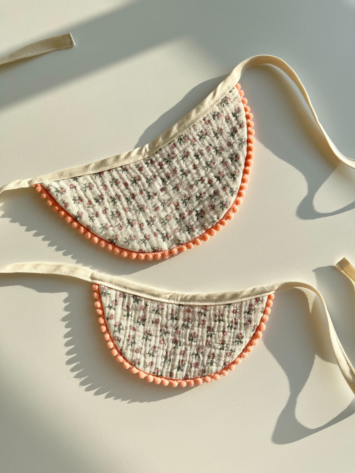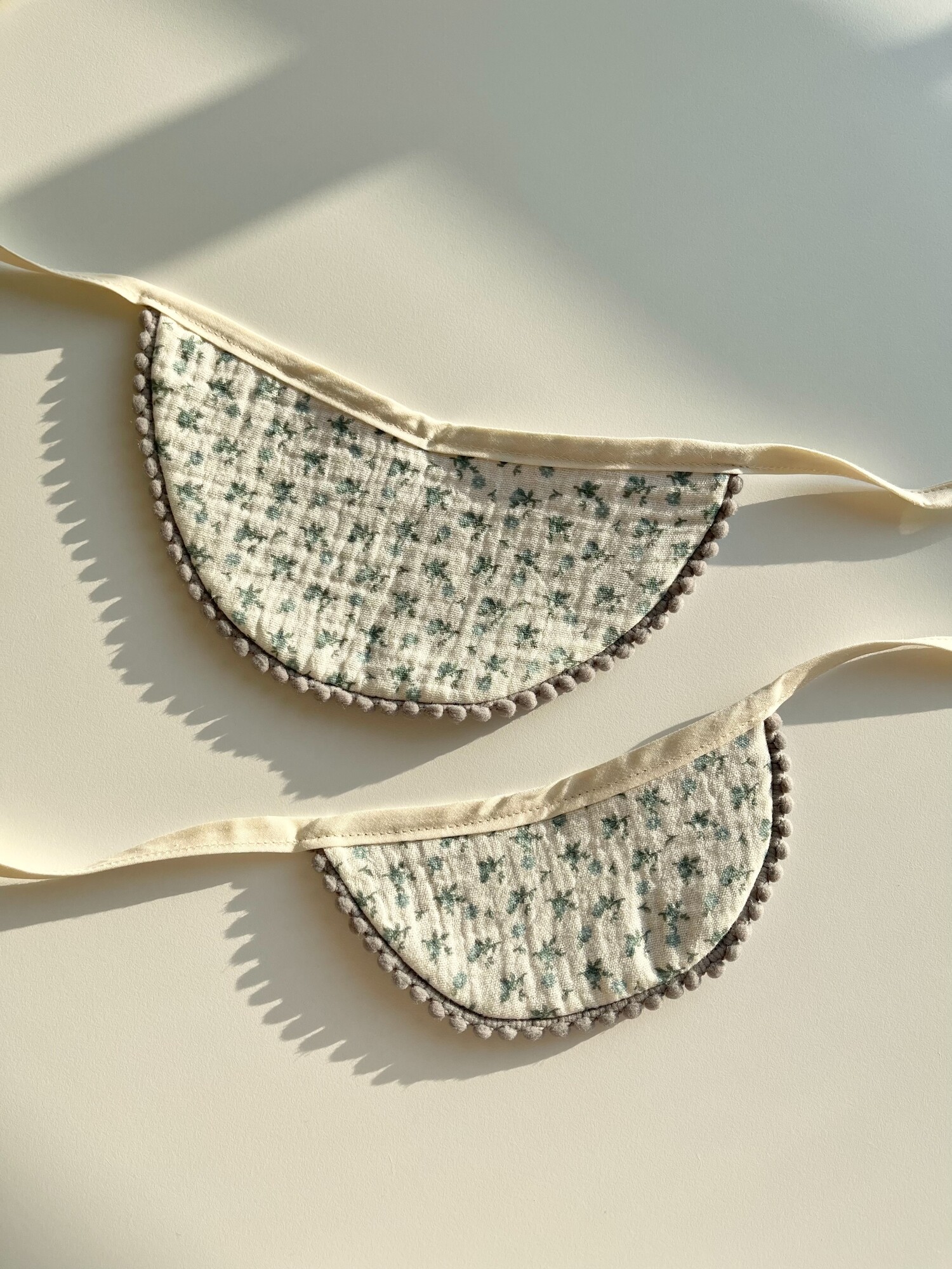 머스터드,핑크,블루 3가지 컬러의 턱받이는 앞면은 무지, 뒷면은 플라워 원단을 사용해서 두가지 스타일로 양면 사용이 가능합니다.