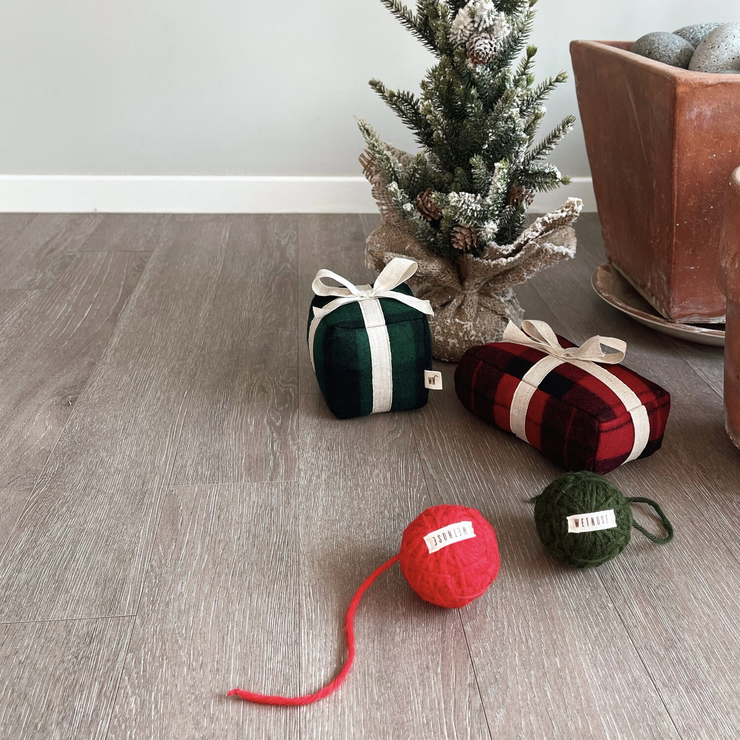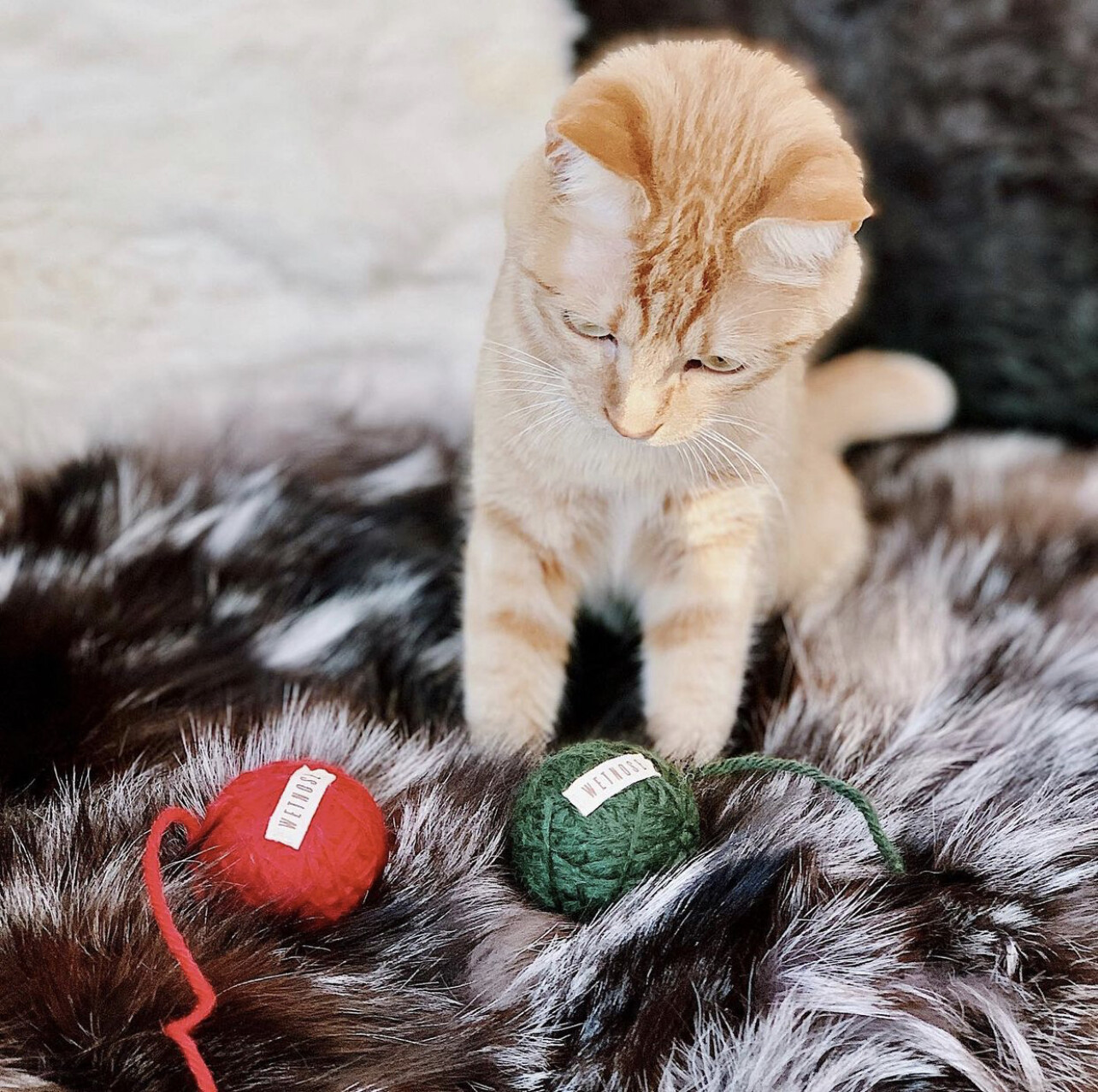빨간색과 녹색의 털실공이 굴러다니고 있네요.
