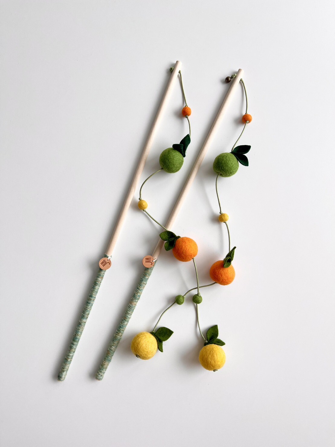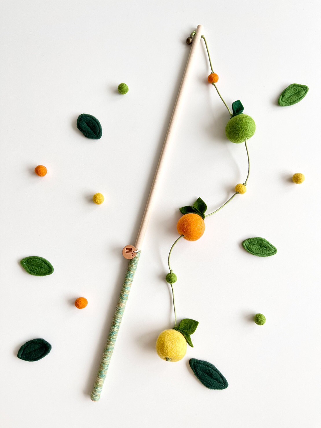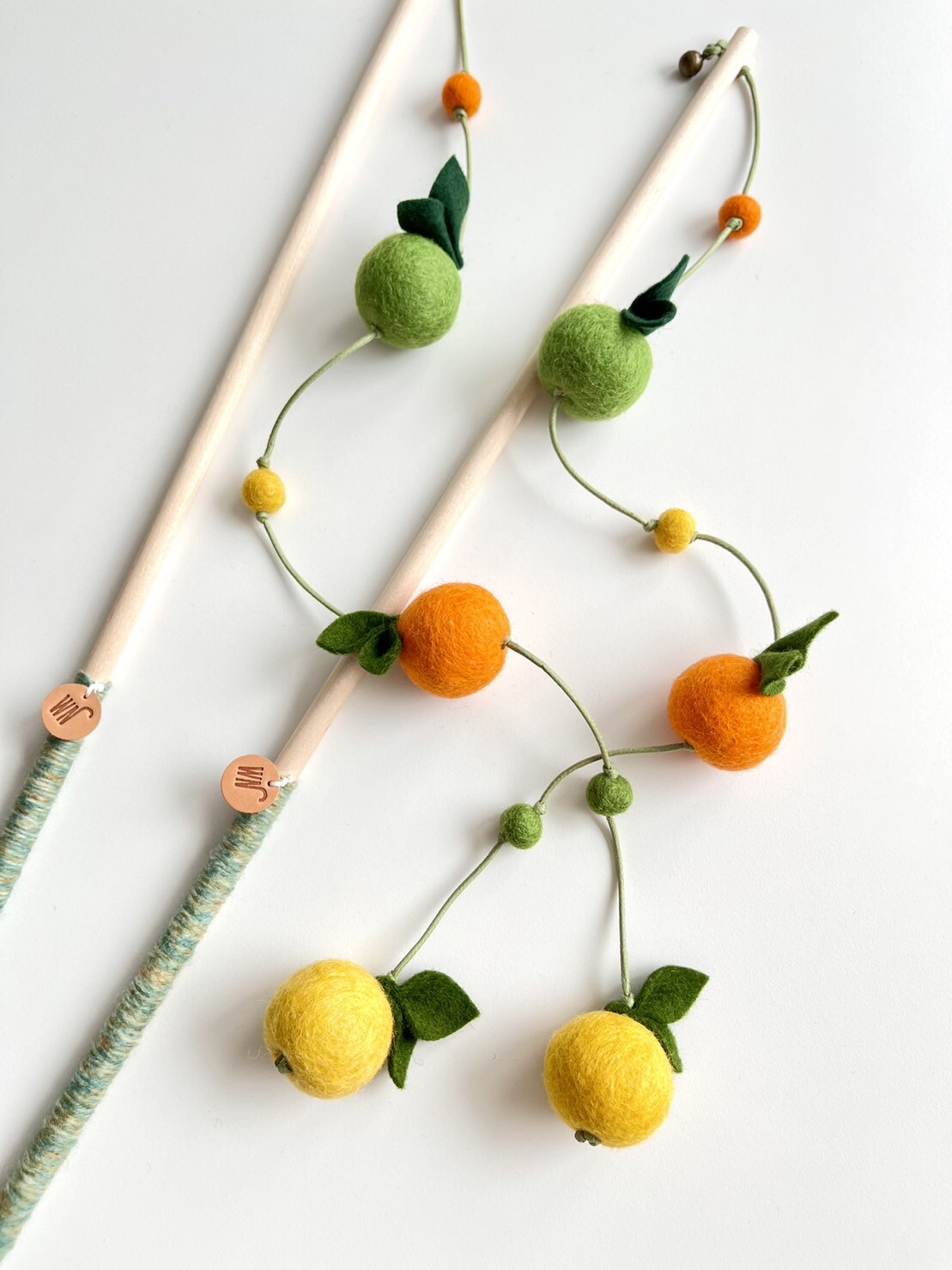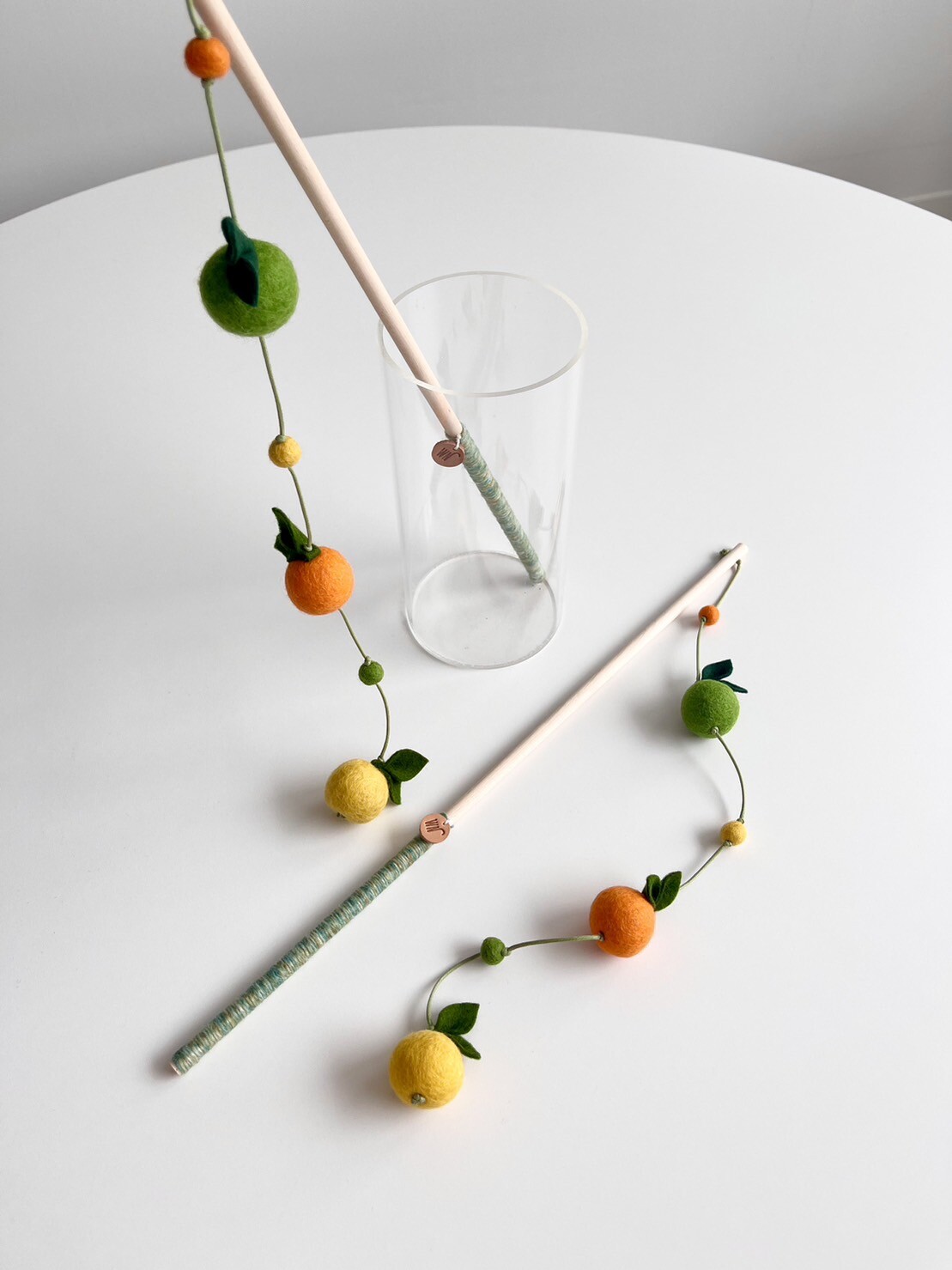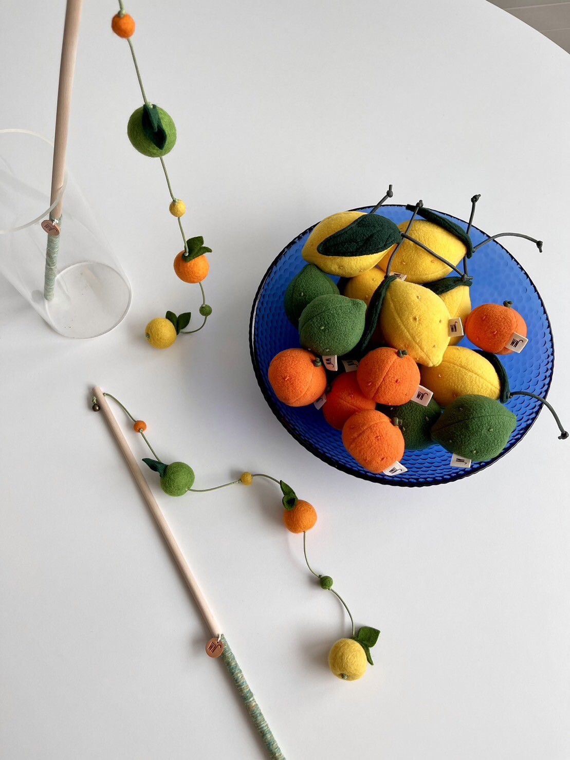 양모볼, 울펠트, 면끈, 자작나무막대, 방울, 울털실, 가죽라벨