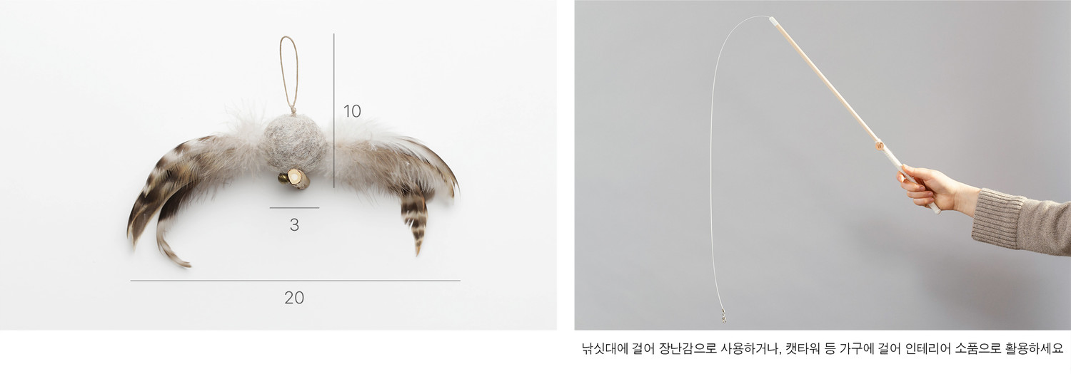 낚싯대에 걸어 장난감으로 사용하거나 동봉 된 끈을 이용해 캣타워, 스크래쳐 등 자유롭게 묶어 장식으로 사용할 수 있습니다.
