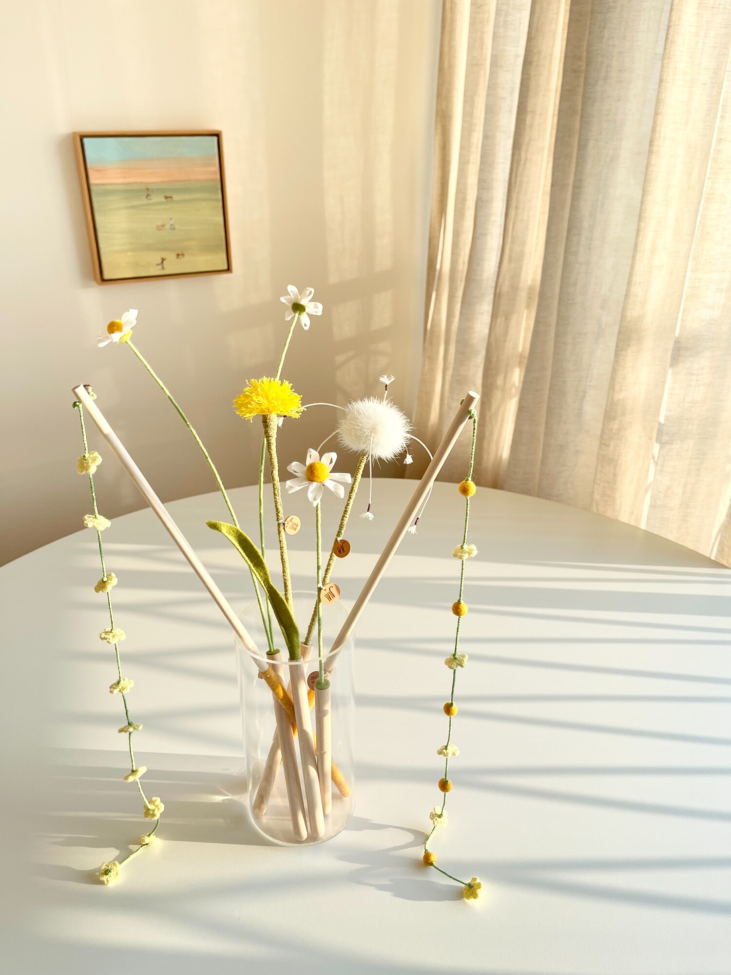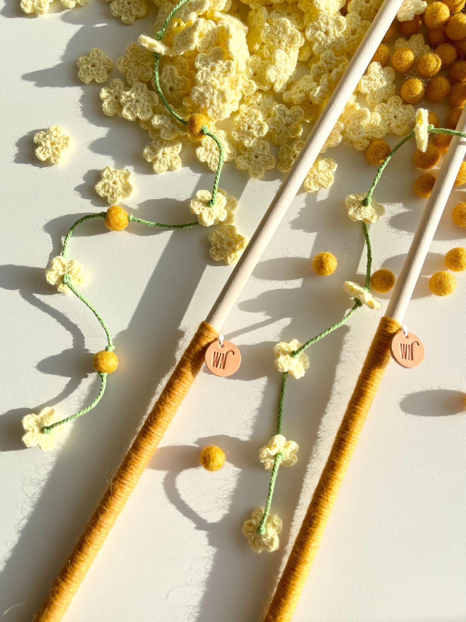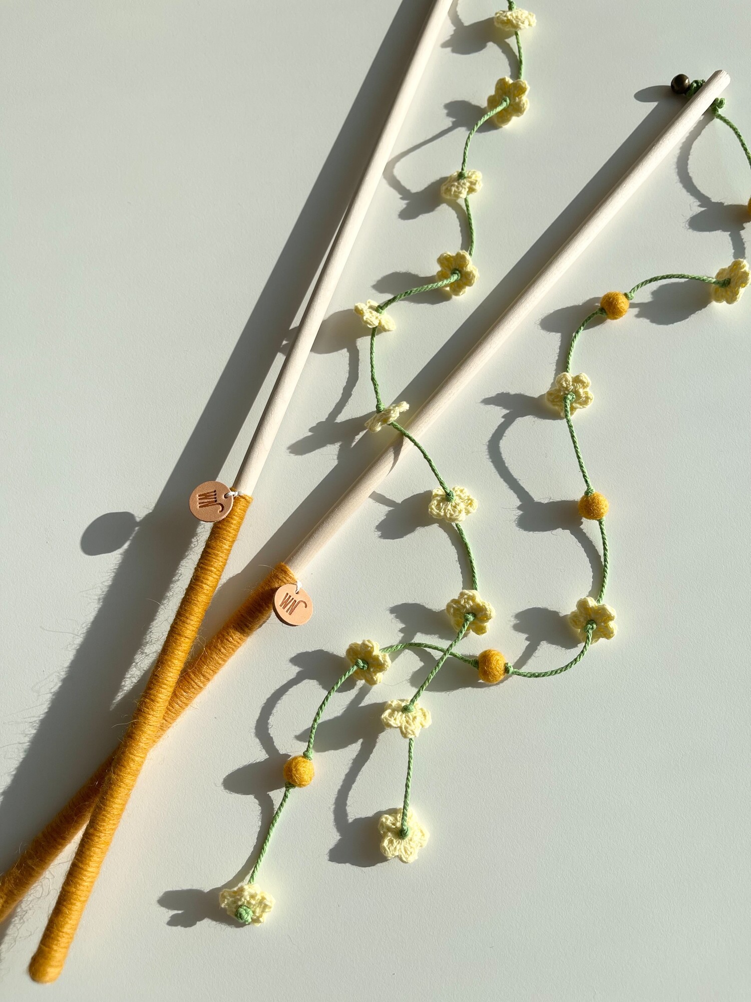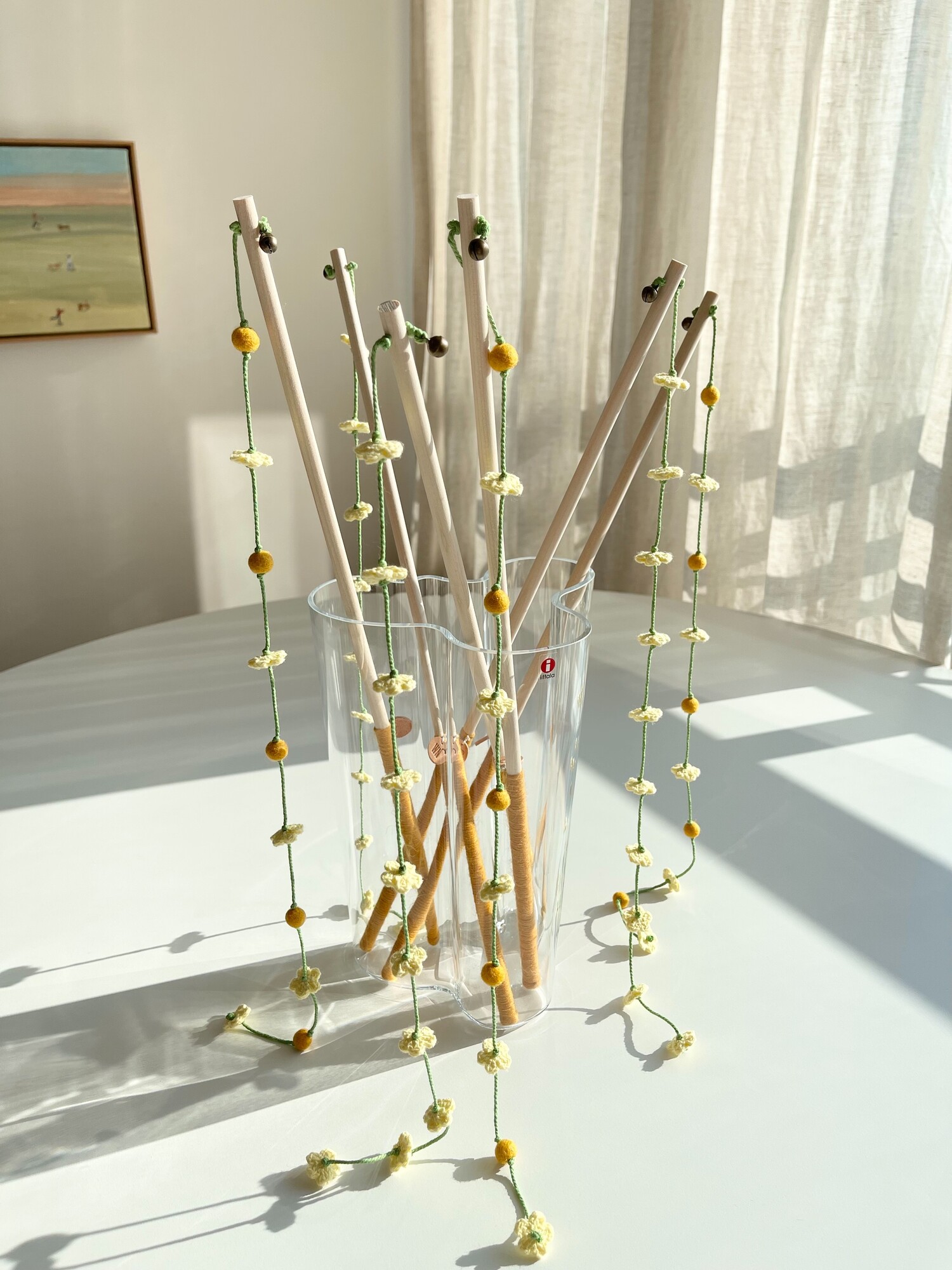 뜨개꽃, 양모볼, 자작나무막대, 방울, 울털실, 가죽라벨