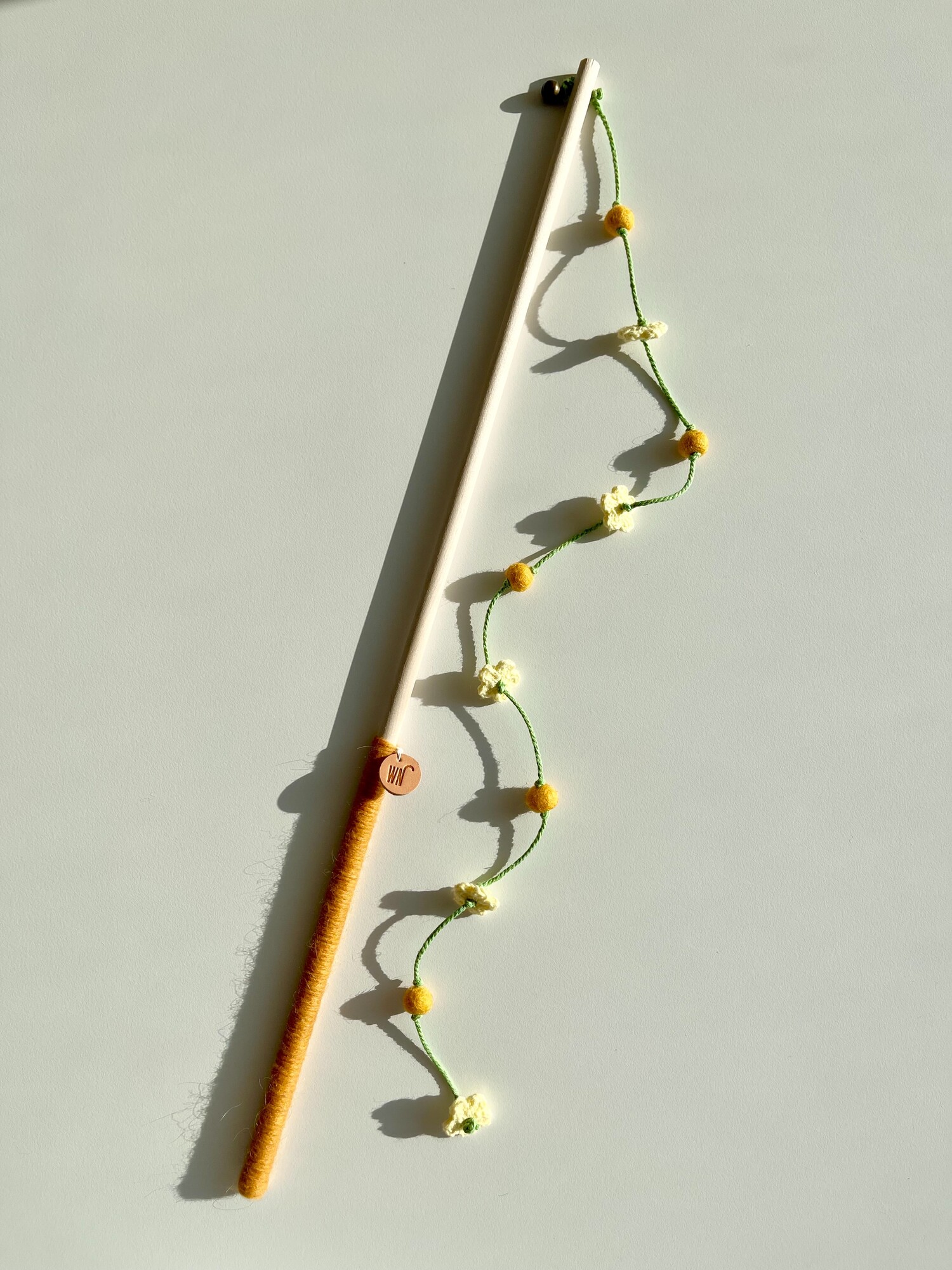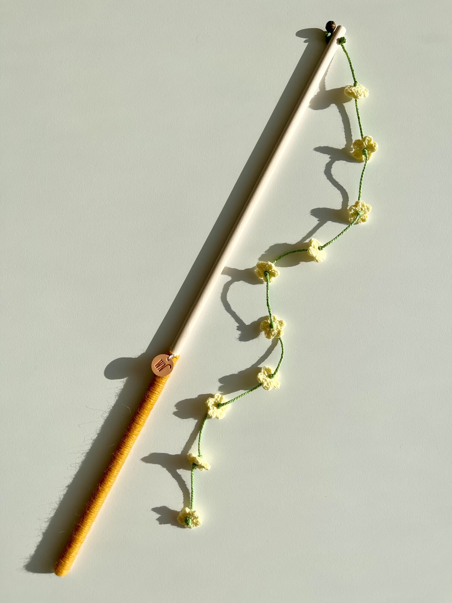 뜨개로 만든 꽃과 천연재료로 색을 낸 뉴질랜드산 100% Pure Wool 양모볼이 50cm 줄에 달려있어 잡고 물고 당기기 쉬우며