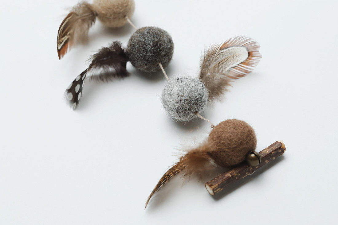 천연재료로 색을 낸 뉴질랜드산 100% Pure Wool, 천연깃털, 개다래 나무, 딸랑거리는 방울 등 고양이가 좋아하는 요소들로 구성되어 있습니다.