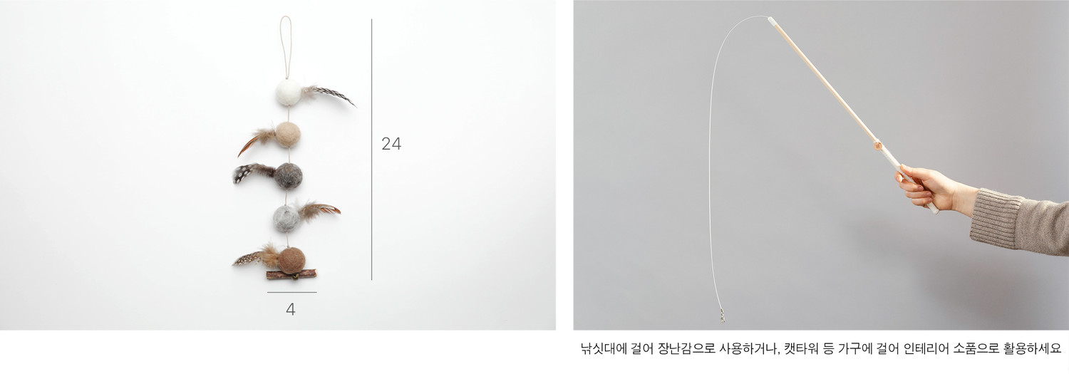 동봉 된 끈을 이용해 캣타워, 스크래쳐 등 자유롭게 묶어 장식으로 사용하거나 낚싯대에 걸어 장난감으로 사용할 수 있습니다.