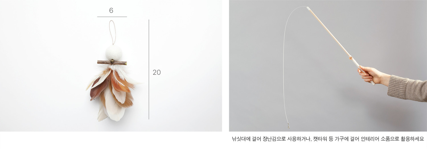 낚싯대에 걸어 장난감으로 사용하거나 동봉 된 끈을 이용해 캣타워, 스크래쳐 등 자유롭게 묶어 장식으로 사용할 수 있습니다.