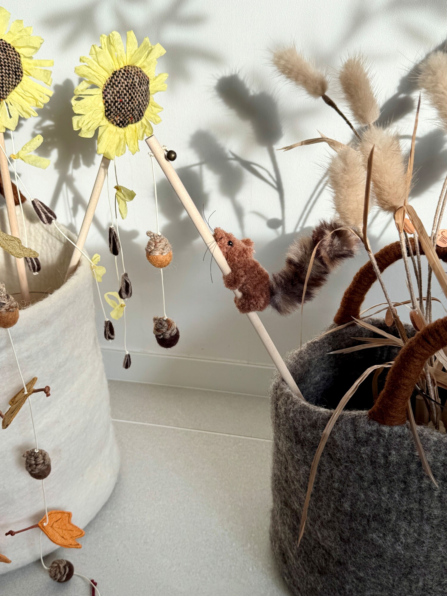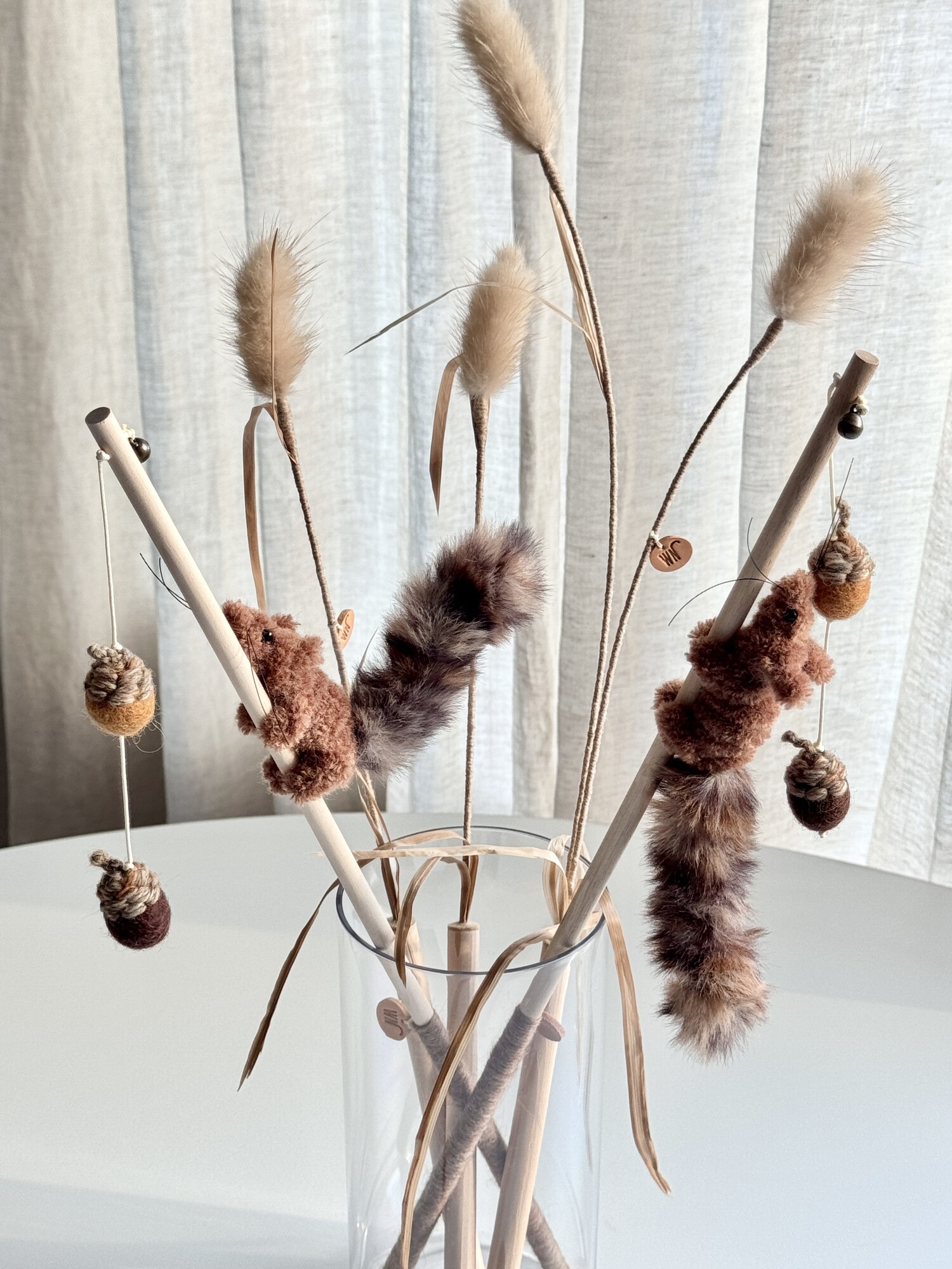 모루, 양모볼, 울털실, 면끈, 자작나무막대, 방울, 가죽라벨