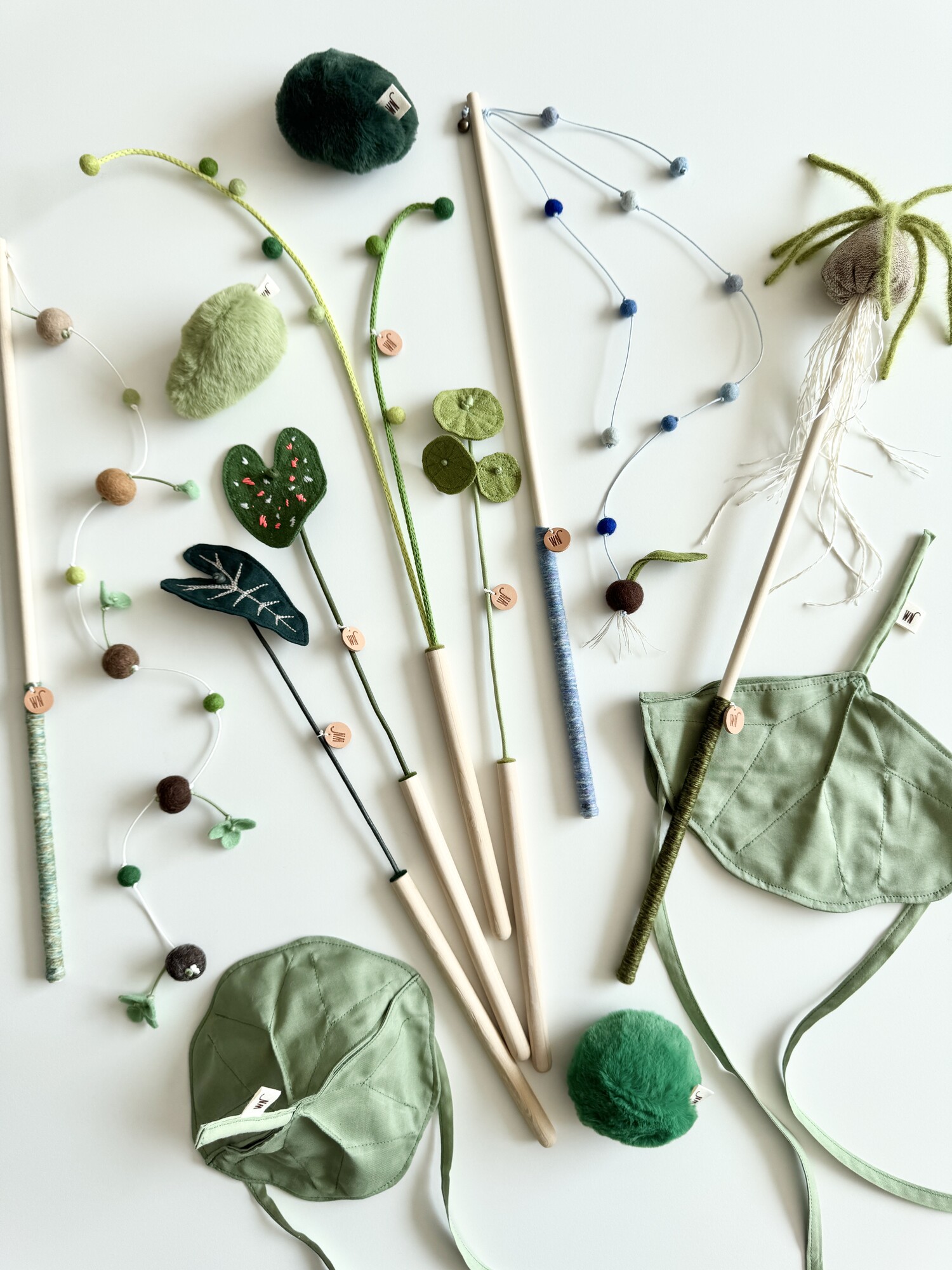 린넨원단, 양모볼, 실, 면끈, 자작나무막대, 방울, 울털실, 가죽라벨