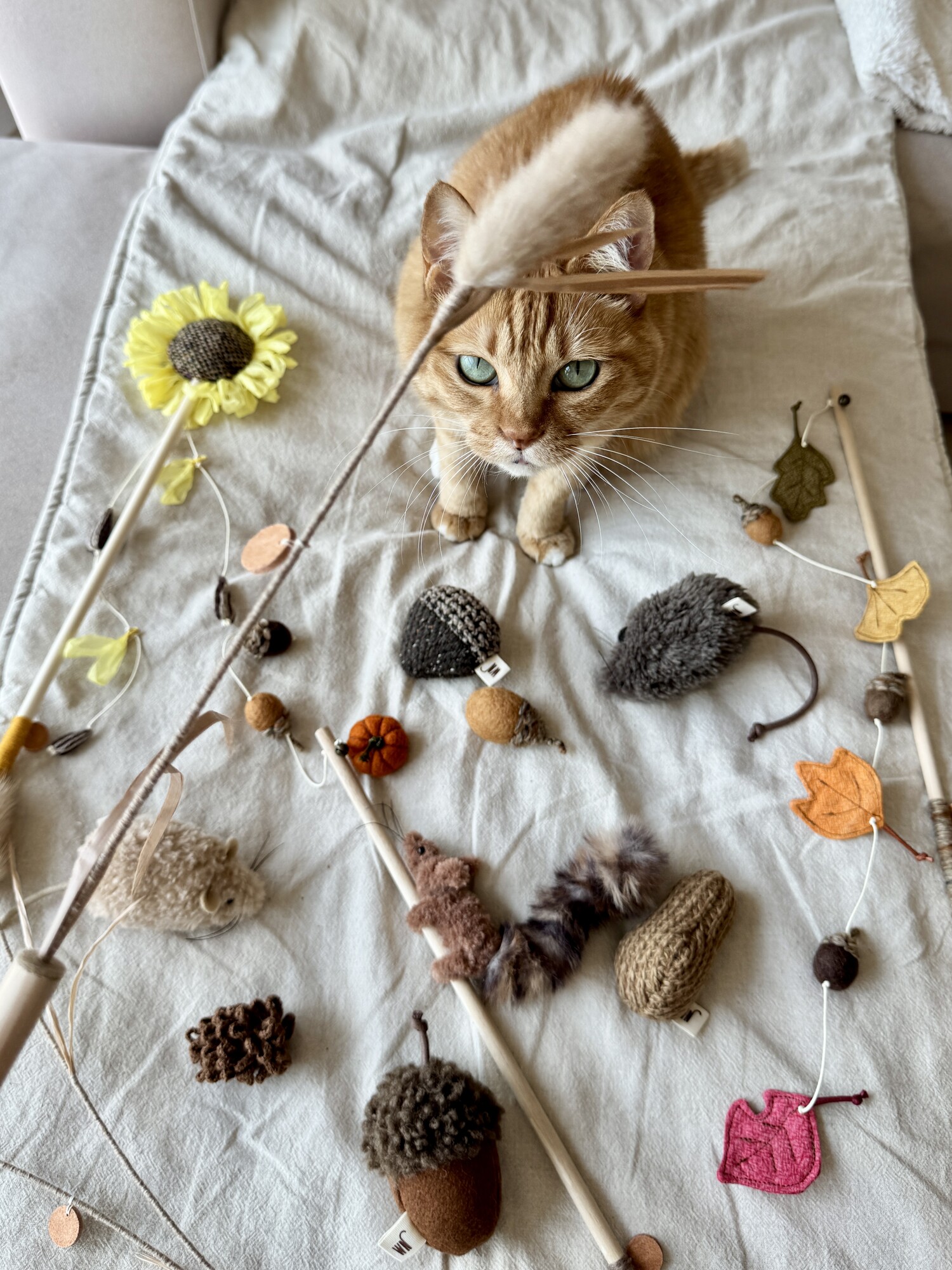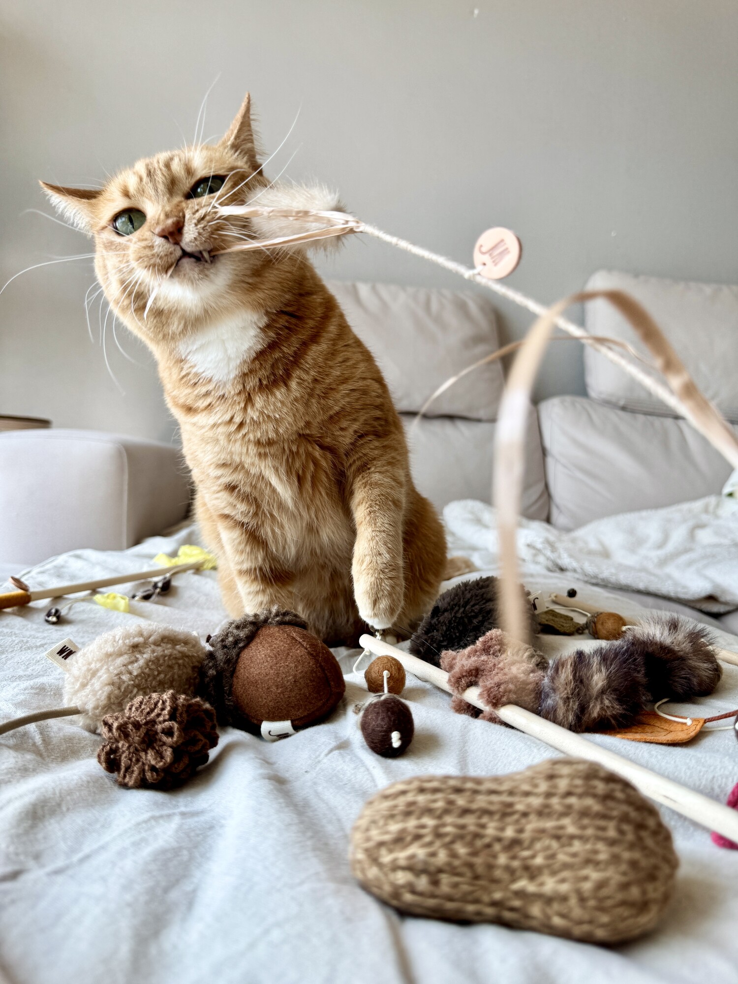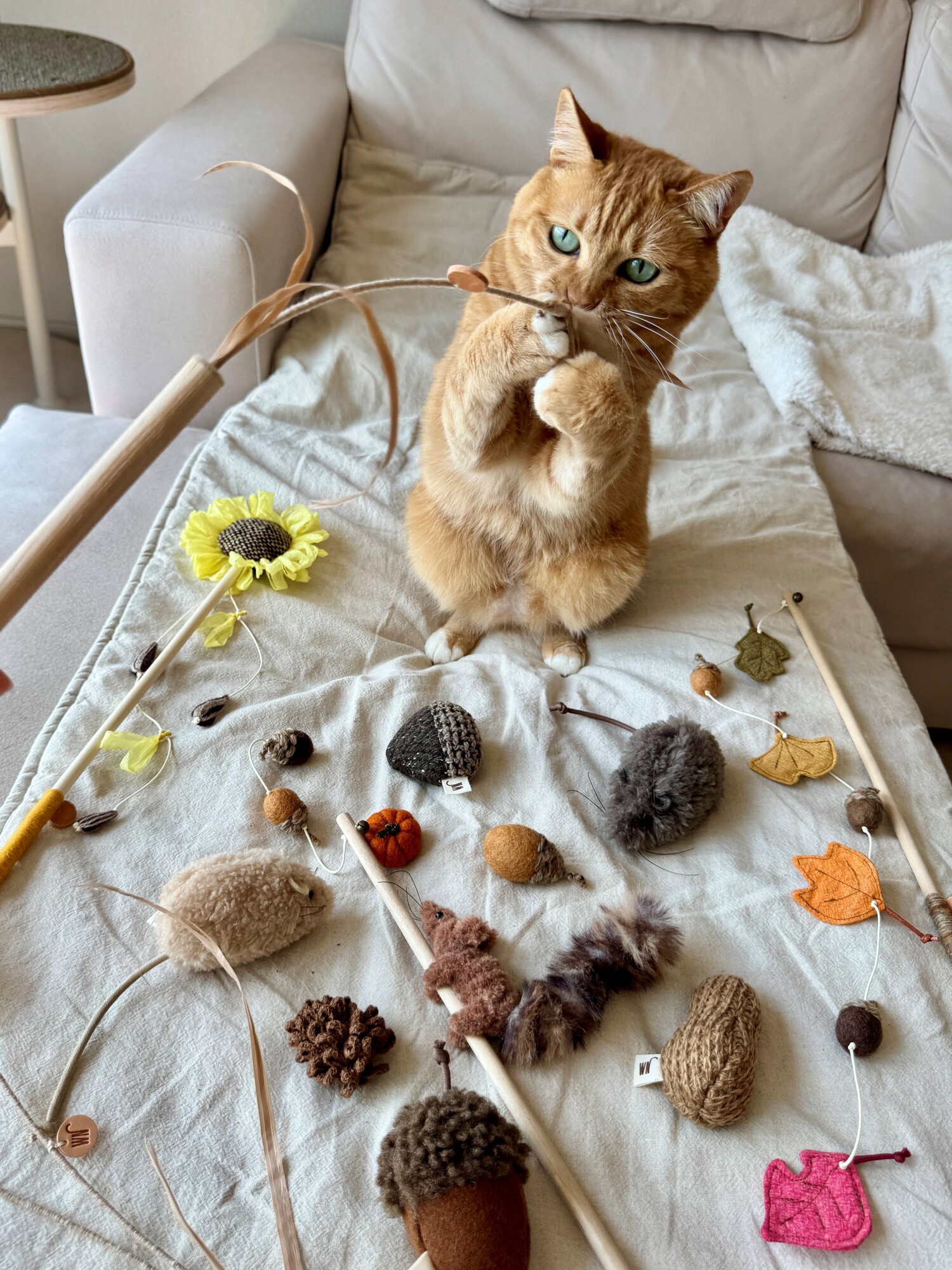 고양이가 끈, 털, 방울 등 장난감을 삼키지 않도록 항상 주의해주세요.